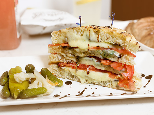 Caprese on Focaccia tomato, fresh mozzarella, basil, balsamic reduction -