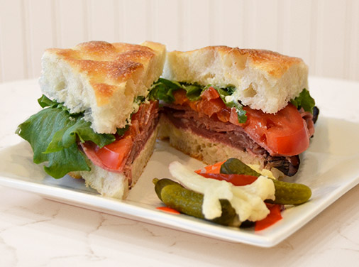 Cured Meats on Focaccia prosciutto, salami, fresh mozzarella, tomato, arugula, mayonnaise -