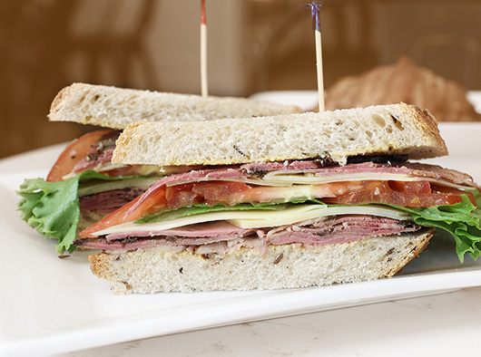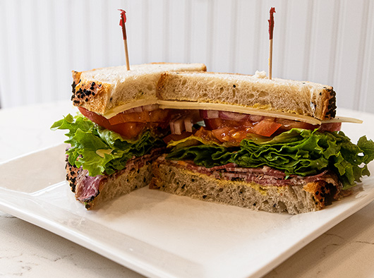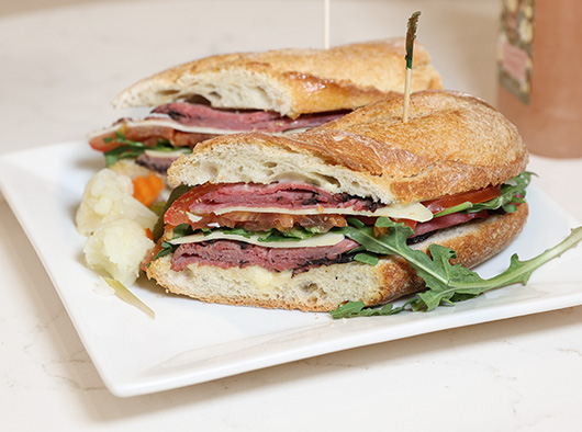 Roast Beef on Baguette cheddar cheese, arugula, tomato, mayonnaise -
