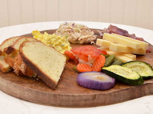Bread Board choice of bread with egg salad, tuna salad, cured meat, cheese, pickles & seasonal vegetables -