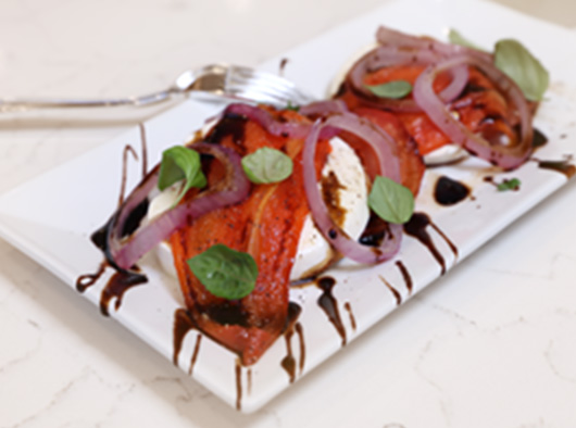 Caprese Salad tomato, fresh mozzarella, marinated roasted red pepper, grilled red onion, fresh basil, balsamic reduction -